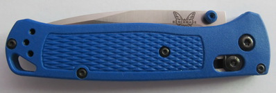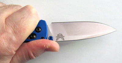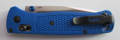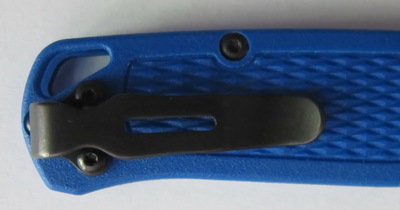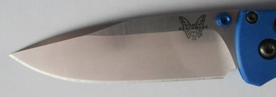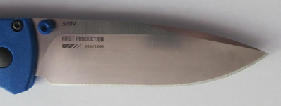 La lame du Bugout est réalisée en acier CPM-S30V de chez Crucible comme le montre sa dénomination. Cet acier qui a été un peu dénigré par certains sur des forums anglo-saxons reste pour Benchmade un acier de très bonne qualité et, c’est aussi mon avis, supérieur à tous les aciers de type 14C28N même doté d’un traitement cryogénique. La qualité du tranchant et la durée de celui-ci reste incontestablement supérieur, même si l’entretien demande beaucoup plus d’attention en contrepartie.