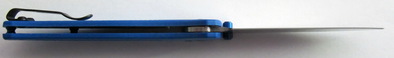 Cette lame se déploie au moyen de deux thumbstuds anodisé de couleur bleu très sympathique qui évoque le Sebenza. Le déploiement de la lame est fluide grâce à la présence de deux rondelles en bronze phosphoreux de part et d’autre de laxe du pivot de la lame. Le crantage des platines de l’Axis Lock donne une bonne surface d’appui pour le pouce.