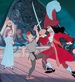 Peter Pan a demandé à Wendy d’être sa mère ; en bon fils il la protège avec un petit couteau contre la longue épée du vilain capitaine Crochet…